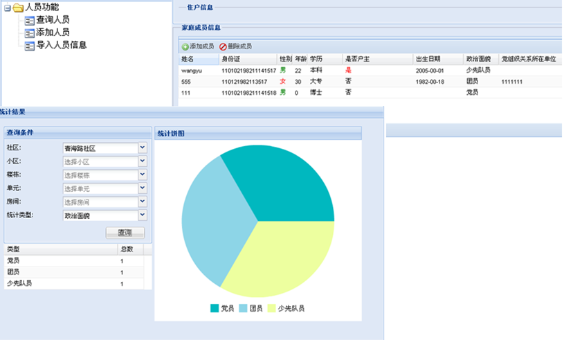 人口管理是社區(qū)工作的主要部分,包括常住人口、暫住人口、流動(dòng)人口、重點(diǎn)人口等。如何科學(xué)有效的對(duì)這些人口進(jìn)行統(tǒng)計(jì)、分析、查詢等,是社區(qū)工作的重點(diǎn)。產(chǎn)品提供的人口管理模塊,可以實(shí)現(xiàn)對(duì)各類人口的分類查詢、統(tǒng)計(jì)分析等功能,實(shí)現(xiàn)對(duì)人口的可視化、科學(xué)化管理。